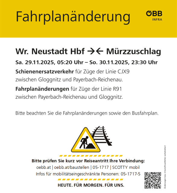 Wegen Bauarbeiten fahren am 29.11. und 30.11. die meisten Züge der Linie CJX9 zwischen Gloggnitz und Payerbach-Reichenau als Schienenersatzverkehr mit Autobussen.