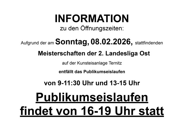 Aufgrund der am Sonntag, 08.02.2026, stattfindenden Meisterschaften der 2. Landesliga Ost auf der Kunsteisanlage Ternitz entfällt das Publikumseislaufen von 9-11:30 Uhr und 13-15 Uhr.