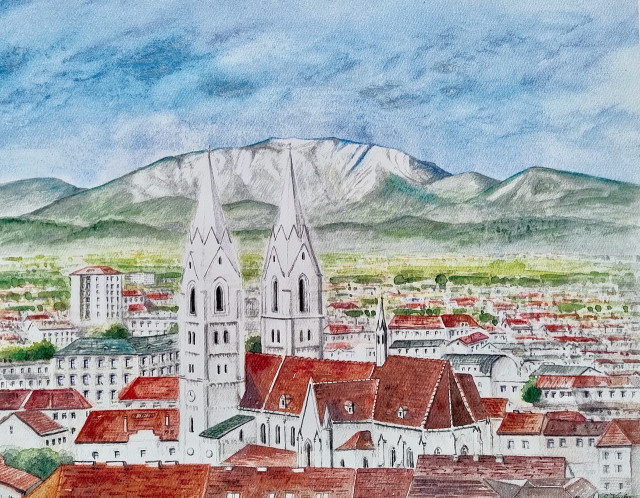 Zum Abschluss der Ausstellung „Stadt - Land - Buch“ von Alexandra S. Vogler in der VILLA IM PARK vermittelt die Künstlerin ihre „Tipps und Tricks zur Aquarell-Technik“, indem man ihr beim Malen eines Aquarells der Maria Hilf Kirche in Sieding über die Schulter schauen kann.