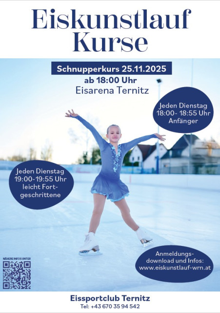 Ab November bietet der Eissportclub Ternitz Eiskunstlaufkurse in der Eisarena Ternitz an. Jeden Dienstag von 18:00 - 18:55 Uhr können Kinder und Jugendliche, die bereits selbständig Eislaufen, einen Anfängerkurs belegen. Hier ist es möglich Grundkenntnisse des Eiskunstlaufes, wie Übersteigen, Rollerschritt, Hocke und vieles mehr zu erlernen. Im Anschluss, von 19:00 - 19:55 Uhr findet der Kurs für leicht Fortgeschrittene statt. Das sind Personen, die vielleicht schon das eine oder andere im Eiskunstlauf gelernt haben und ihre Kenntnisse vertiefen oder auffrischen wollen.